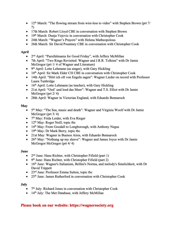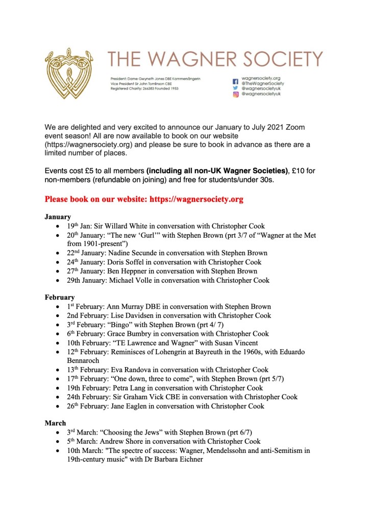 The Wagner Society are excited to announce the launch of their Zoom Events season for January to July 2021. Bookings for the events can now be made via the society website, and a copy of the full programme can be downloaded via the link below.